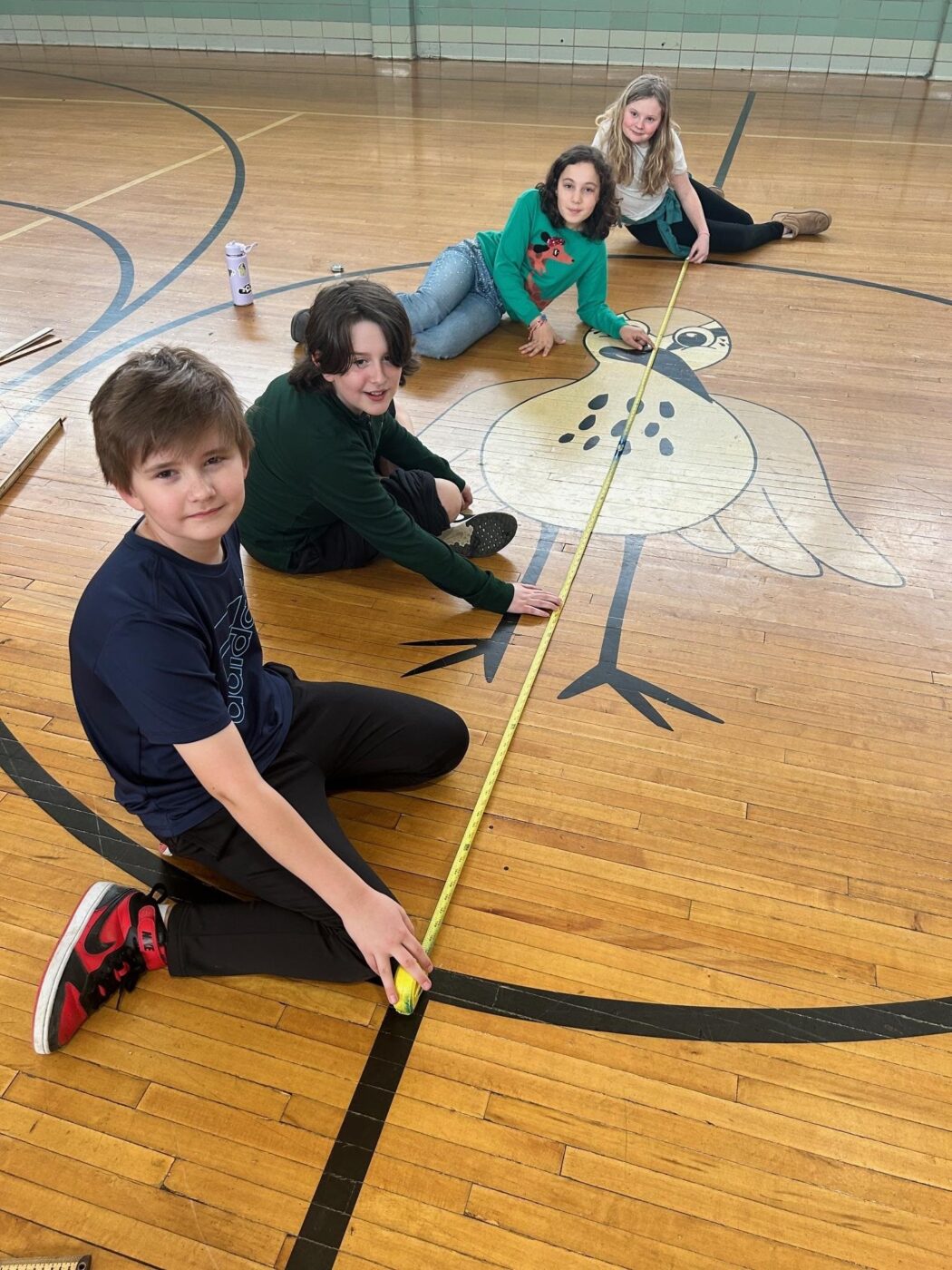 The design team is considering salvaging a portion of the original 1949 gym wood floor with the “Savannah” school mascot. 5th grade “architects” showed off their math skills to help answer some questions for the design team. Ms. Bergin’s math students measured the diameter of the center-court circle in the gym, making this a meaningful hands-on experience. As the final fifth grade class to occupy the existing building before its demolition later this fall, their involvement symbolizes a connection between the past, present, and future.