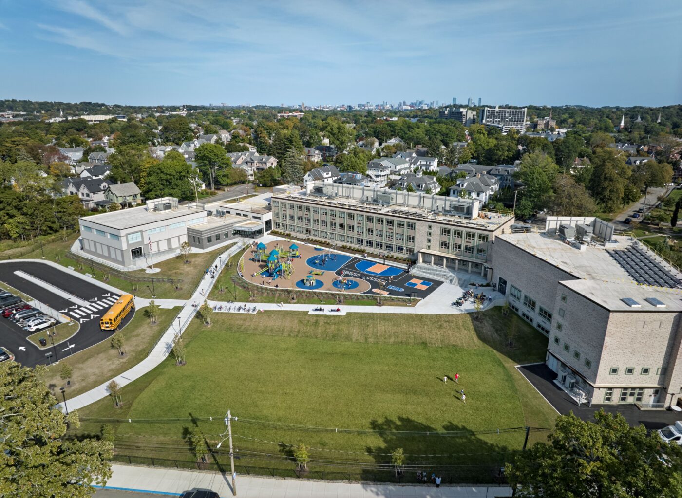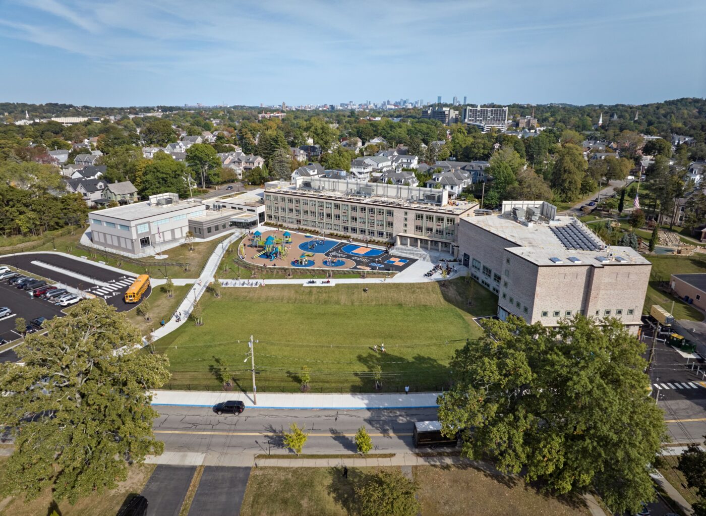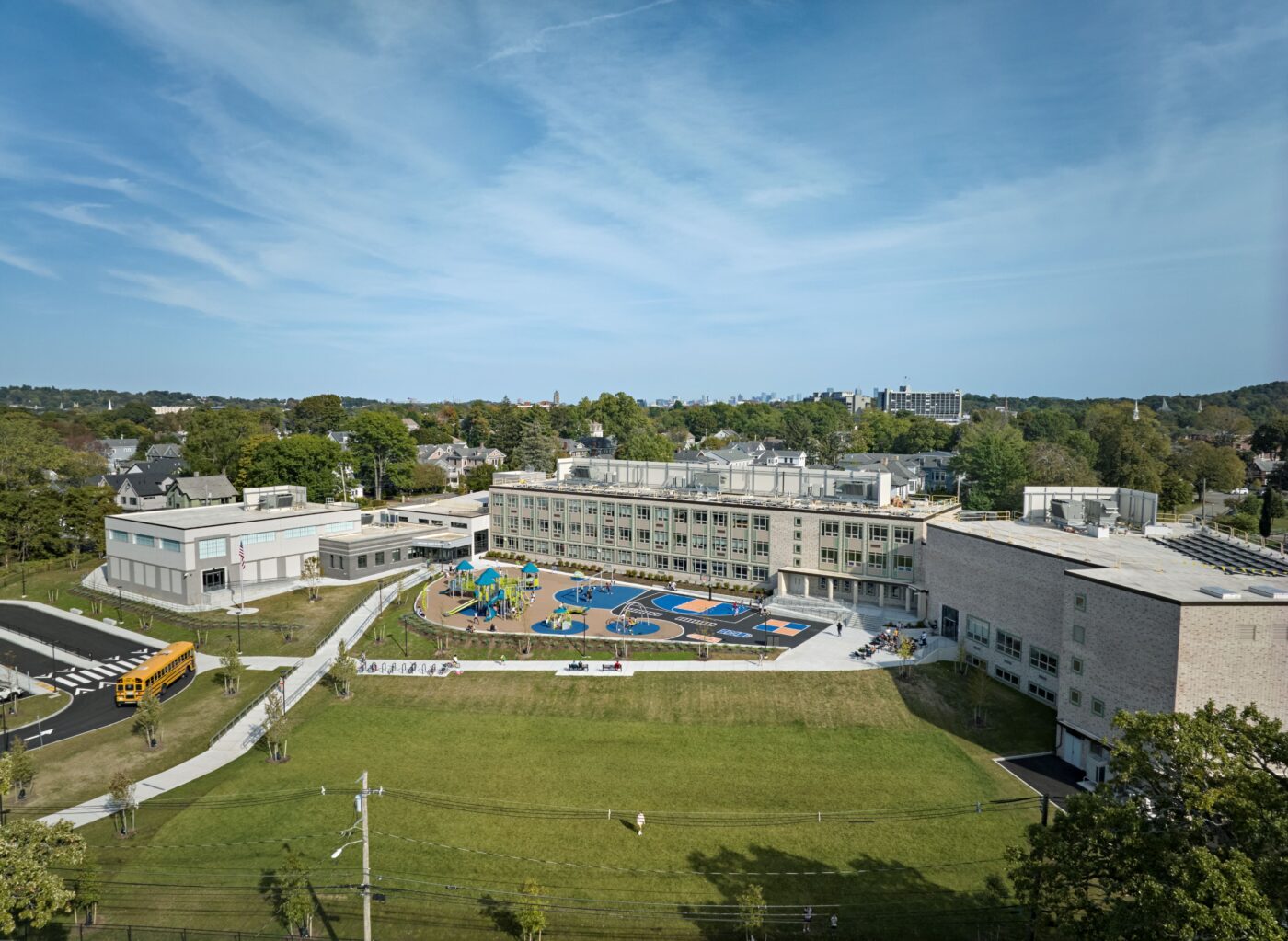 The new 98,000-square-foot school will feature fully renovated classrooms, an upgraded auditorium, and a new cafeteria with modern kitchen facilities. A newly constructed addition will house the school’s main office, secure entrance and lobby, library, and gymnasium. Designed with sustainability at its core, the building targets net-zero energy performance through a high-performance building envelope, energy-efficient HVAC systems, and rooftop solar photovoltaic panels.