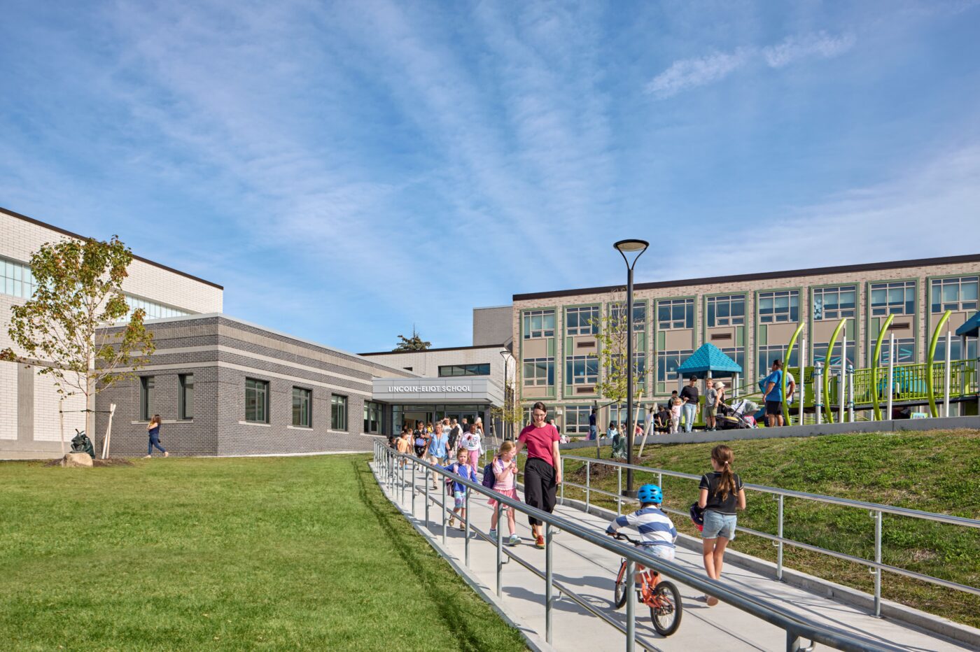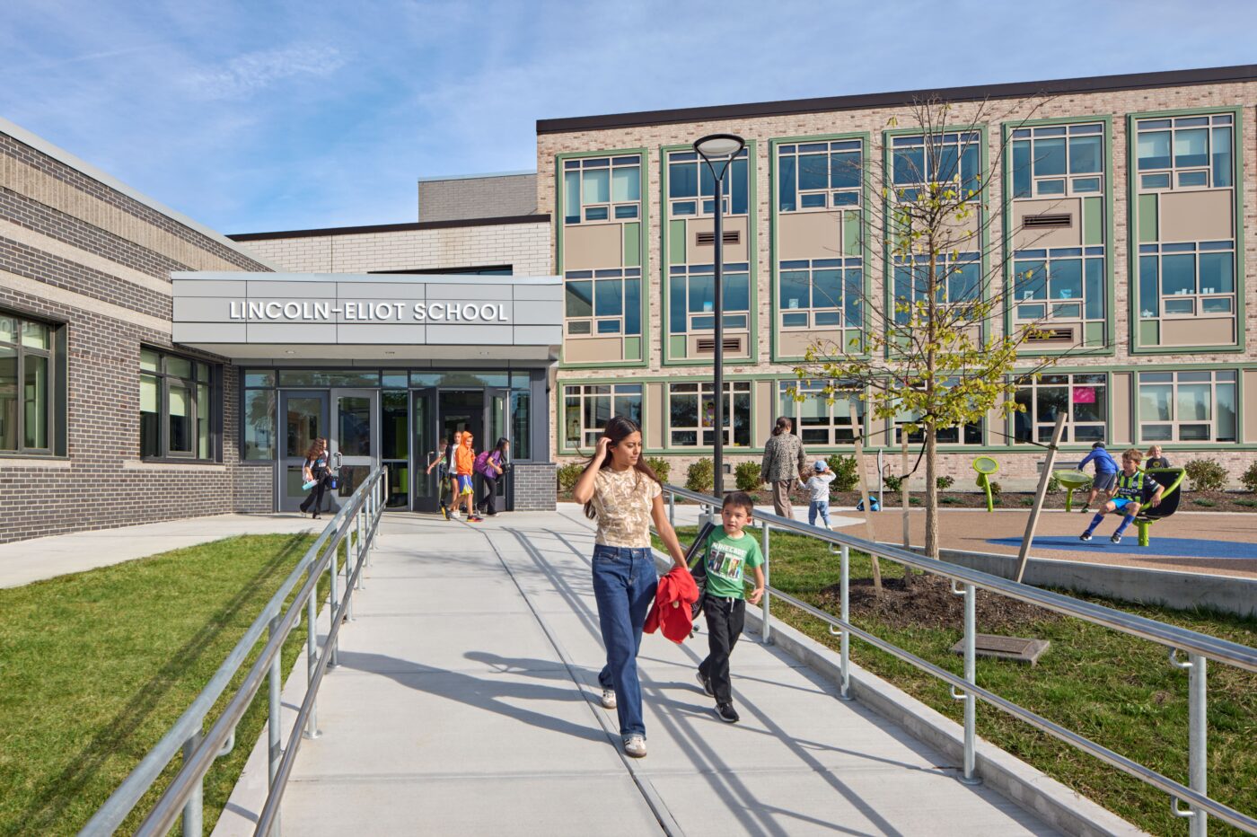 Lincoln-Eliot Elementary School currently serves approximately 450 students in grades K–5, including a district-wide special education program. The project reimagines the original 1965 building into a modern, student-centered facility that fosters flexible, engaging learning experiences. The new design supports both independent and small group instruction and expands opportunities for outdoor play and exploration.
