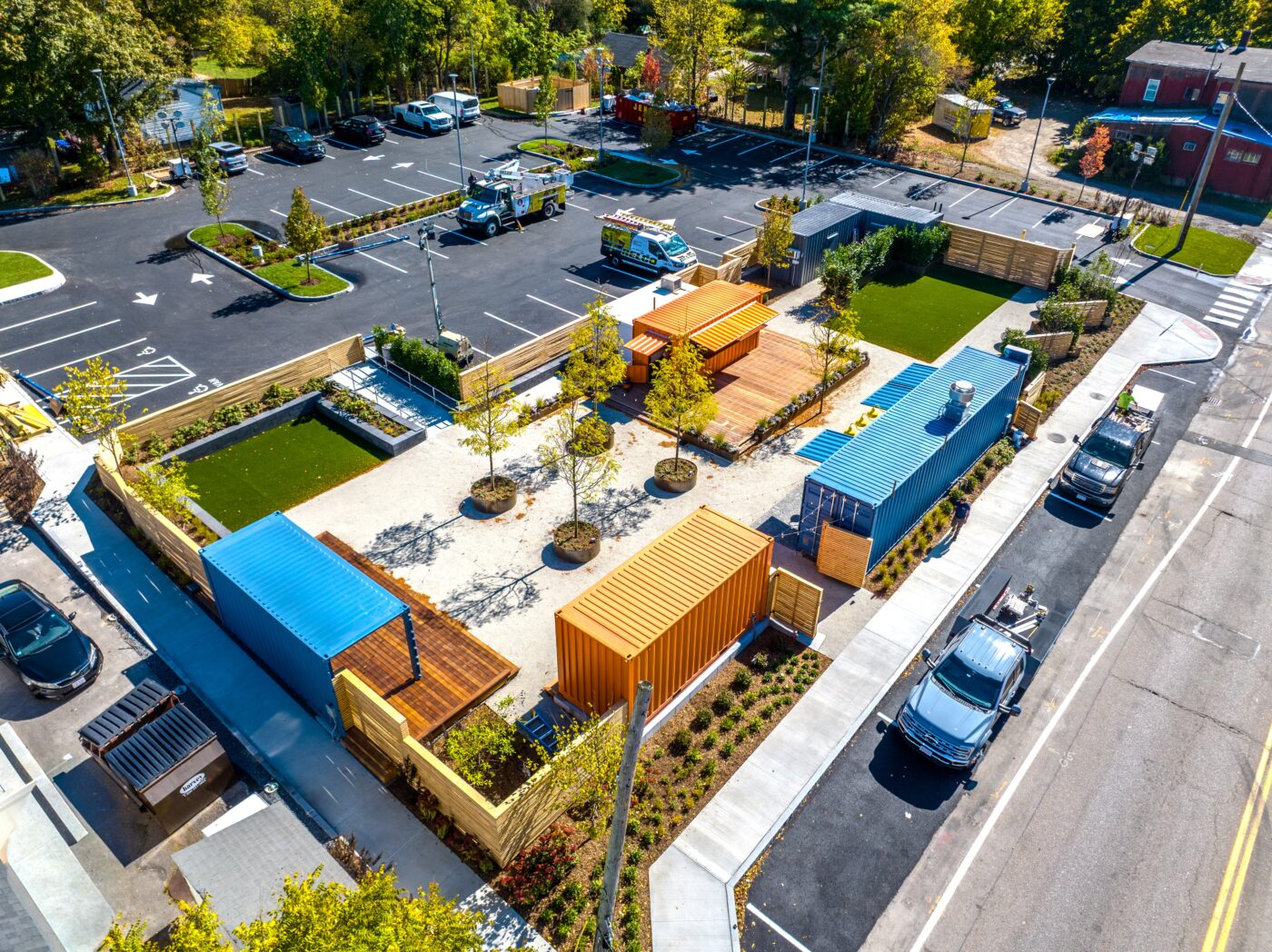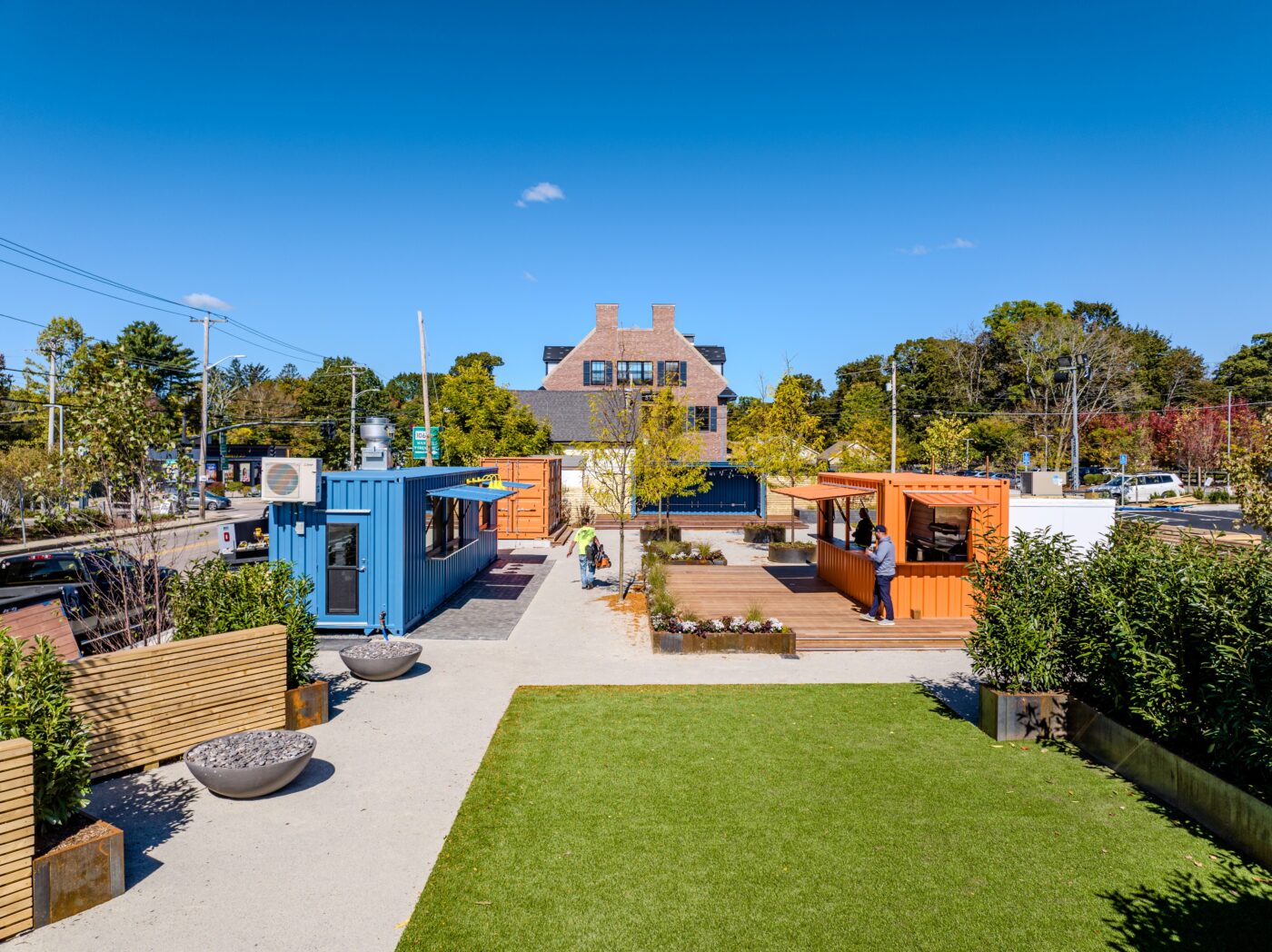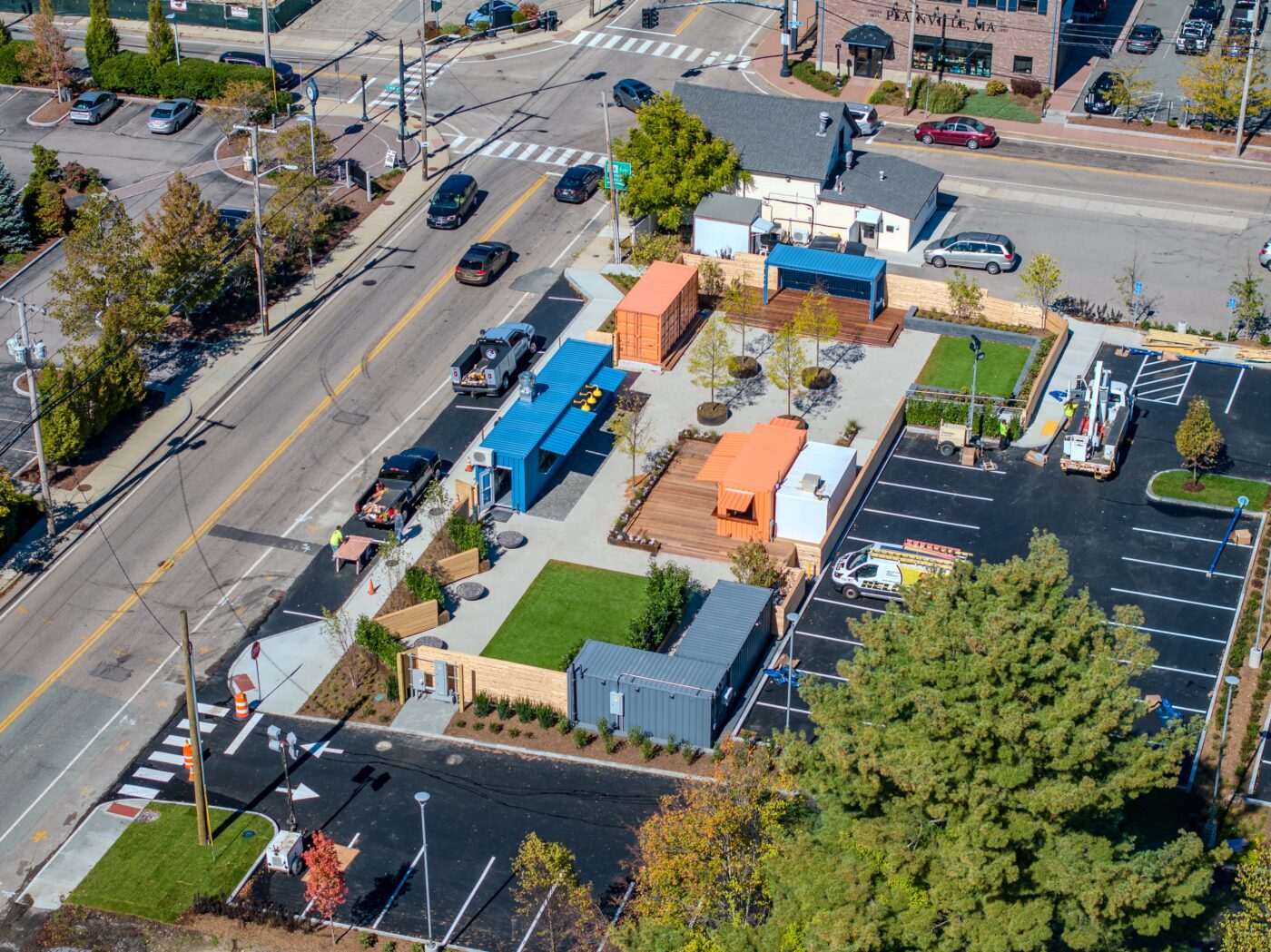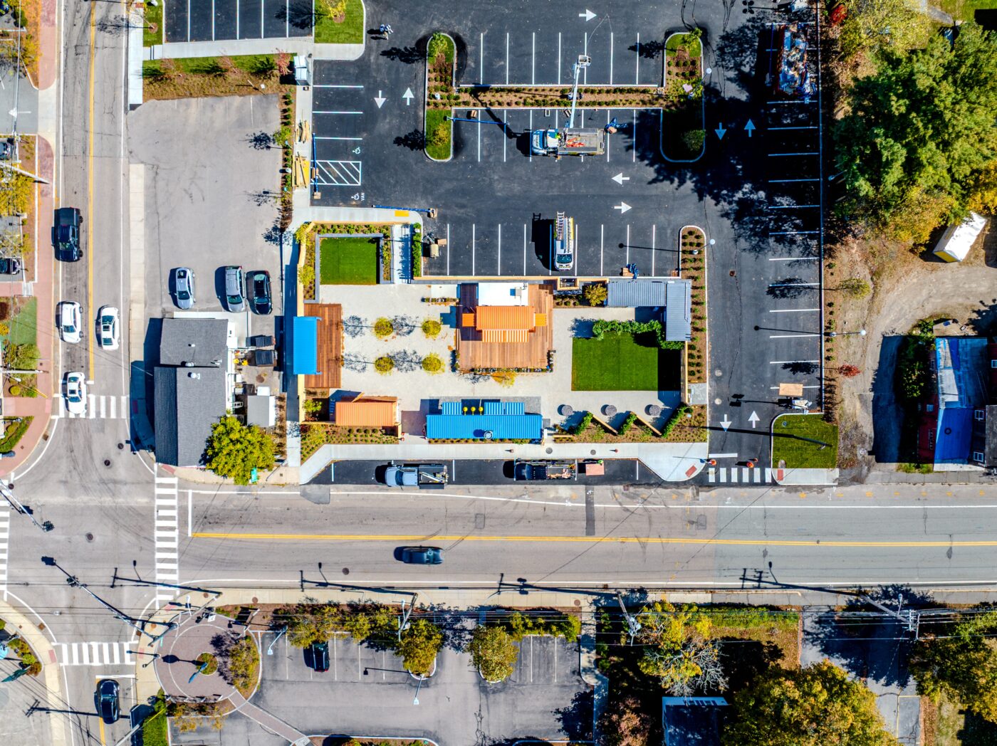 In 2021, Jeff and his wife Julie Kinney brought in the Arrowstreet team to help realize his vision of a revitalized town center which respected Plainville’s historical prominence in the textile and manufacturing sectors while providing vitality and flexibility for the future. Arrowstreet’s master plan addresses Kinney’s long-term goals while considering immediate improvements. Working in collaboration with CWDG landscape architects, a series of park and commercial spaces provide community gathering and economic opportunities for a revitalized town center. Early phases include the introduction of a food and beer garden featuring performance areas and lawn games. To keep this area flexible for future development, a series of customized shipping containers that can be moved to future sites are planned. Also in phase 1 is a town green designed to host community events such as arts and music festivals and farmers’ markets. These early project components are strategically located at two corners of the main intersection in the town square to immediately transform the site.