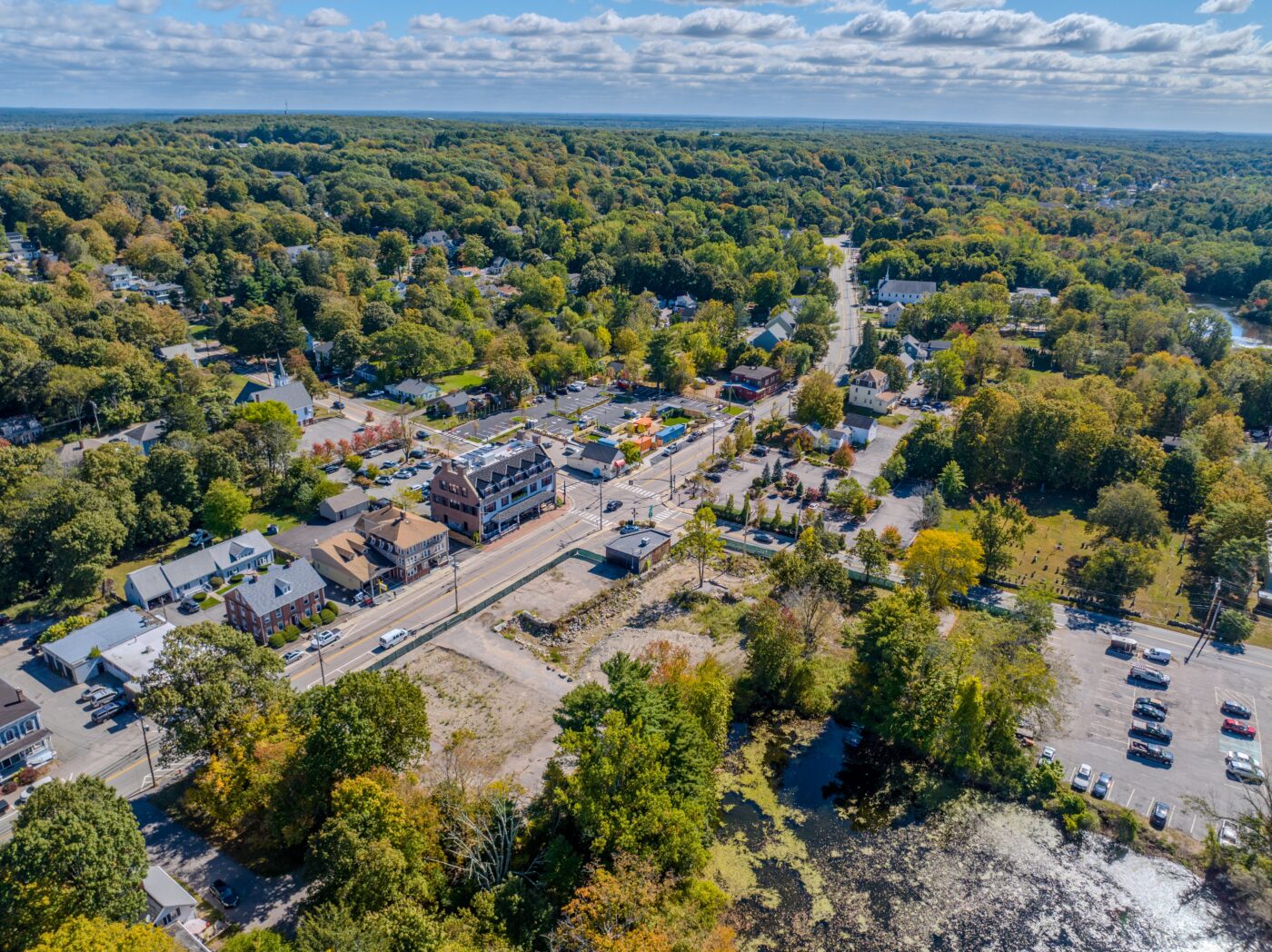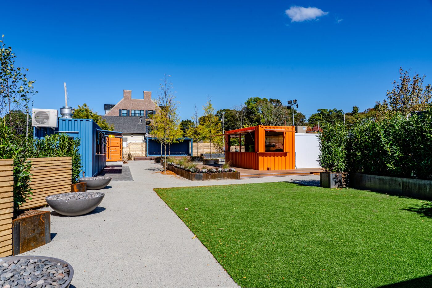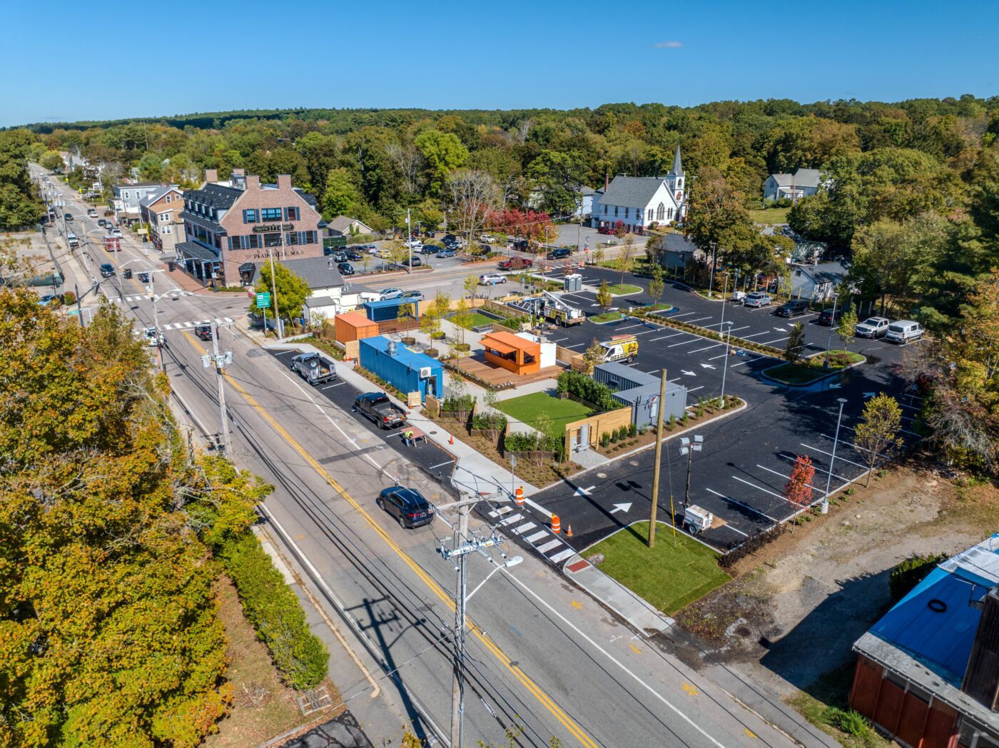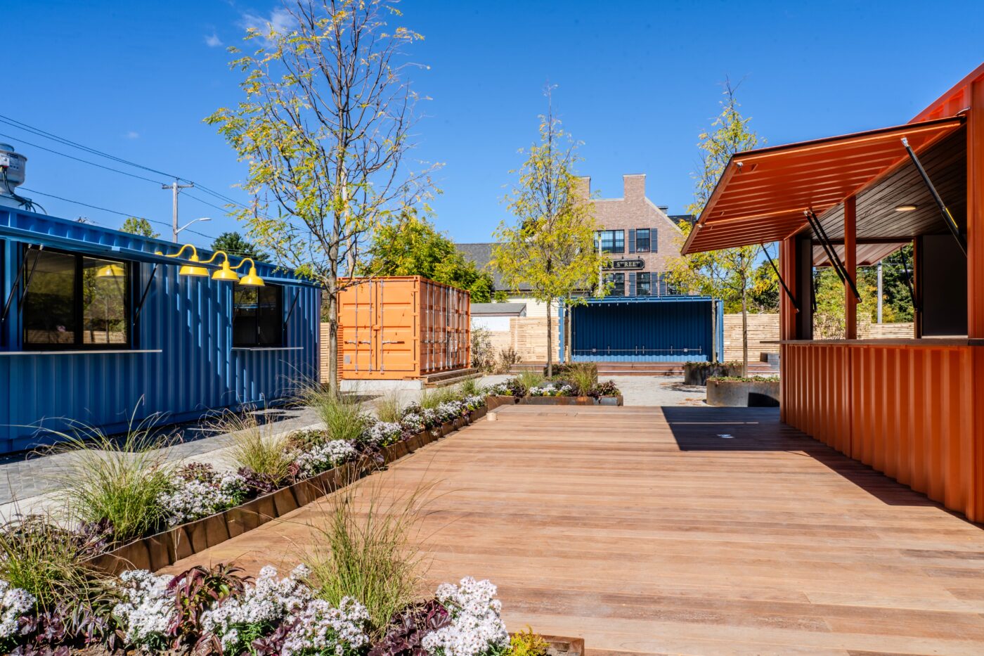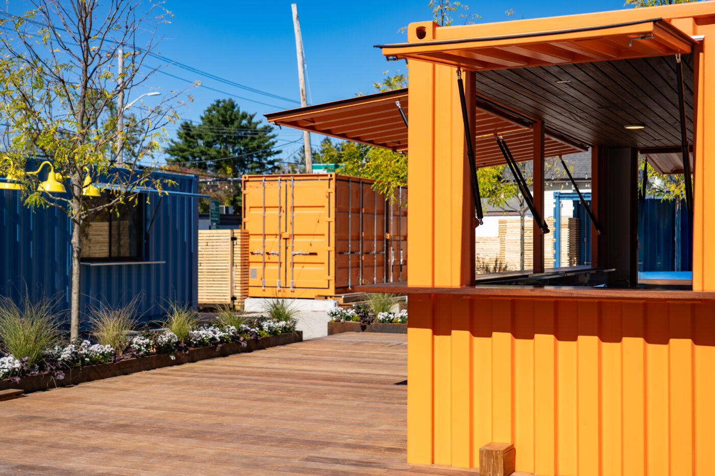 In 2021, Jeff and his wife Julie Kinney brought in the Arrowstreet team to help realize his vision of a revitalized town center which respected Plainville’s historical prominence in the textile and manufacturing sectors while providing vitality and flexibility for the future. Arrowstreet’s master plan addresses Kinney’s long-term goals while considering immediate improvements. Working in collaboration with CWDG landscape architects, a series of park and commercial spaces provide community gathering and economic opportunities for a revitalized town center. Early phases include the introduction of a food and beer garden featuring performance areas and lawn games. To keep this area flexible for future development, a series of customized shipping containers that can be moved to future sites are planned. Also in phase 1 is a town green designed to host community events such as arts and music festivals and farmers’ markets. These early project components are strategically located at two corners of the main intersection in the town square to immediately transform the site.